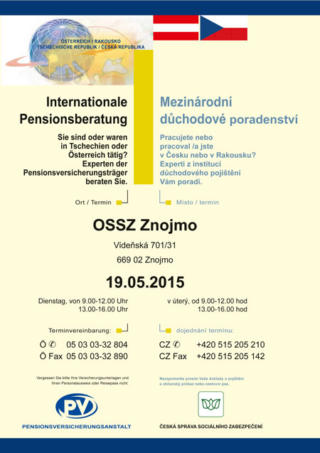 Pracovali jste nebo stále pracujete v Česku a v Rakousku a nevíte například to, jakým způsobem se vám budou započítávat odpracované roky do důchodu? Především pro vás je určen další mezinárodní konzultační den, který se letos uskuteční v úterý 19. května ve Znojmě. Konzultace nejen pro přeshraniční pracovníky, tzv. pendlery, připravila a odborně zajistila Česká správa sociálního zabezpečení (ČSSZ) ve spolupráci s rakouským nositelem důchodového pojištění Pensionsversicherungsanstalt (PV).