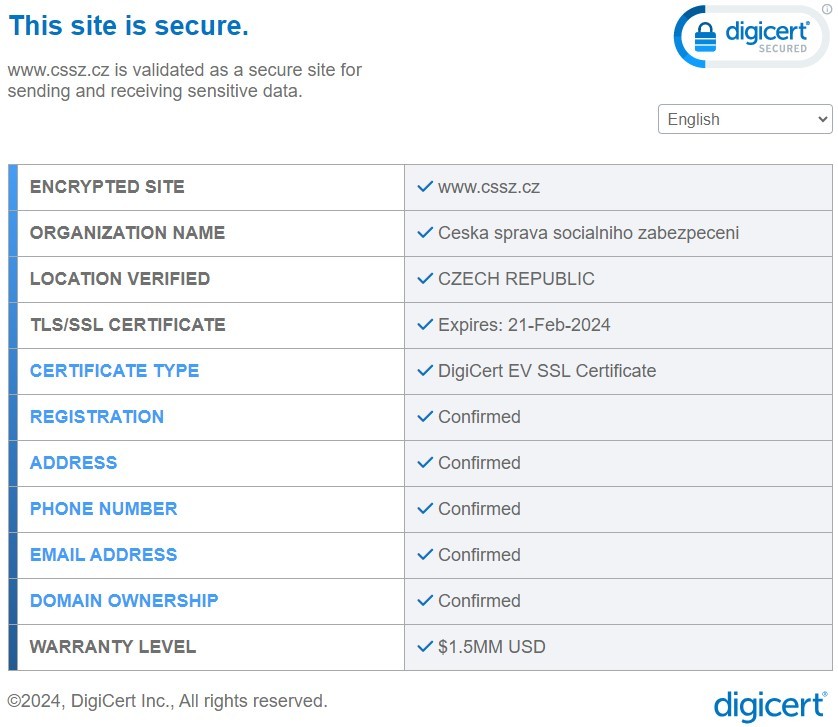 Jediné oficiální stránky ČSSZ jsou www.cssz.cz a eportal.cssz.cz, jejich bezpečnost garantuje digitální pečeť společnosti DigiCert umístěná na webové stránce vpravo dole. Po kliknutí na pečeť se zobrazí identifikační údaje ČSSZ a návštěvník stránek snadno zjistí všechny informace o majiteli webu.